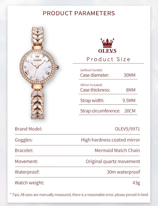 With its sparkling design and luxury appearance, the OLEVS 9971 makes an ideal gift for birthdays, anniversaries, weddings, Valentine’s Day, or any special celebration.
